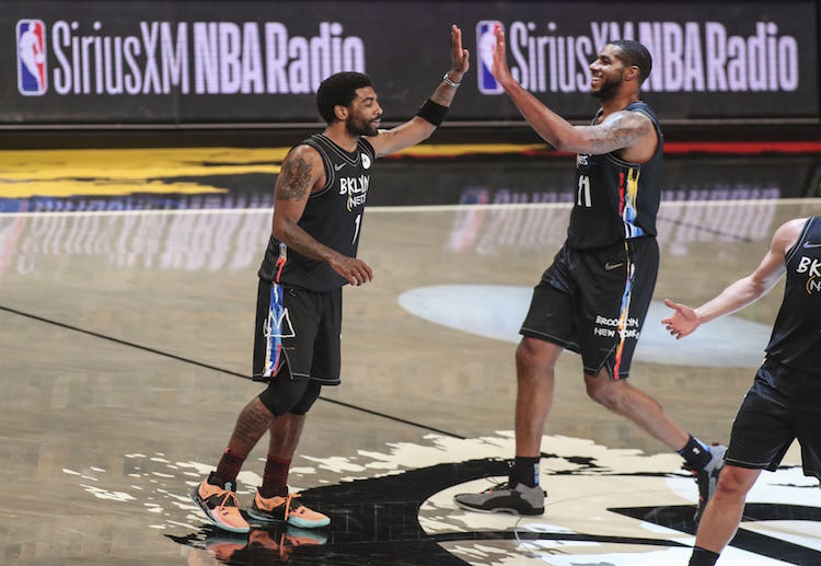 Brooklyn Nets star LaMarcus Aldridge celebrates with Kyrie Irving during a match against the New Orleans Pelicans