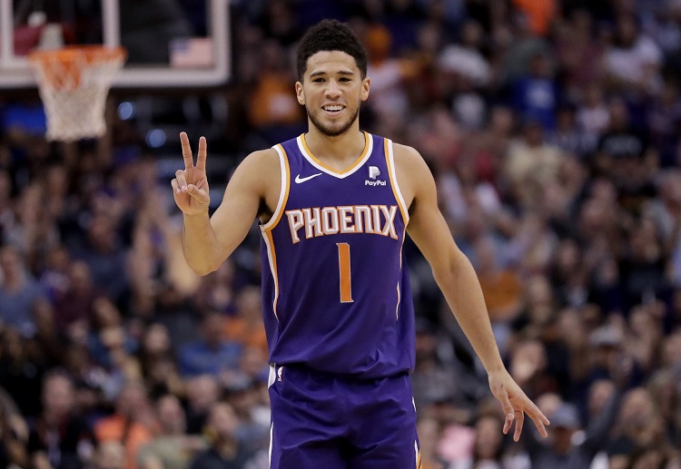 Phoenix Suns guard Devin Booker motions to a teammate during an NBA match against Brooklyn Nets