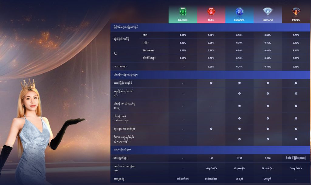 SBOTOP VIP ပရိုဂရမ်သည် Emerald၊ Ruby၊ Sapphire၊ Diamond မှ Infinity အထိ အဆင့်များပါရှိသည်။ သင်၏လှည့်ပတ်ကြိမ်ရေများမှတဆင့် ယခုပင် အမှတ်များရယူပြီး SBOTOP ၏ အကောင်းဆုံး 24 နာရီဝန်ဆောင်မှုကို ခံစားလိုက်ပါ။