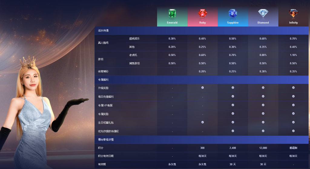 SBOTOP VIP 计划设有多个等级,从翡翠、红宝石、蓝宝石、钻石到永恒等级,为您提供逐步提升的尊享体验。现在就开始通过投注积累积分,尽享SBOTOP全天候的专属服务。
